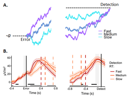 As shown in the Figure below, by imposing different (second-order) boundaries on a post-decisional evidence signal, the model can capture these different expressions of performance monitoring. Moreover, predicted signatures of this model have been observed in the Pe component.